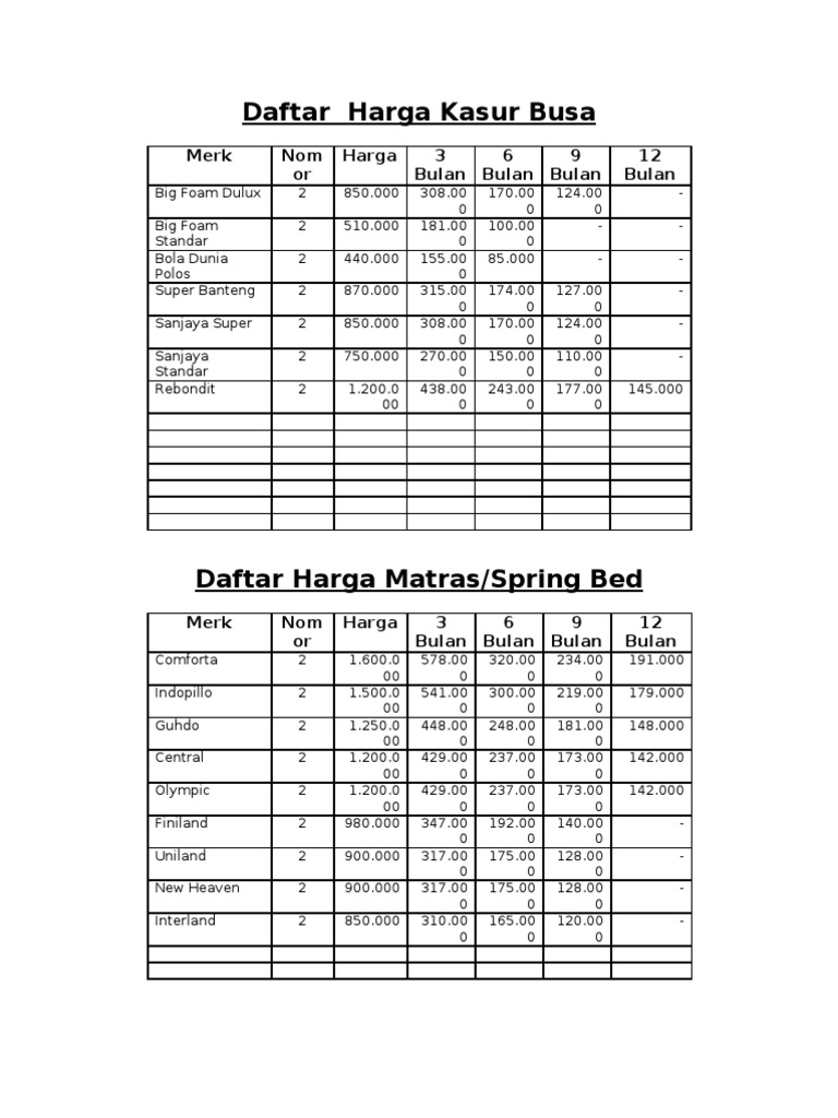 1 from Dengan harga kasur busa inoac yang menarik melayani wilayah bekasi, tambun, cibitung, setu, cikarang, bantar gebang, jatisampurna, cikarang pusat, babelan, sukatani, karang bahagia. Selain ukuran, baik ukuran kasur maupun busa, daftar harga kasur busa rebonded juga dipengaruhi oleh jumlah minimum order. Kasur busa memiliki banyak variasi tingkat kelembutan, dimulai dari yang sangat lembut hingga yang kaku. Mengedepankan segi kepraktisan dan keunggulan busa anti kempes, brand satu ini makin terkenal dengan harga kasur. Dokumen serupa dengan daftar harga kasur busa. Selain kasur busa inoac, kami juga menyediakan sofa lipat atau yang biasa disebut dengan sofa bed. Berikut daftar harga untuk kasur inoac september 2015. Silahkan disesuaikan dengan motif dan bugdet anda.